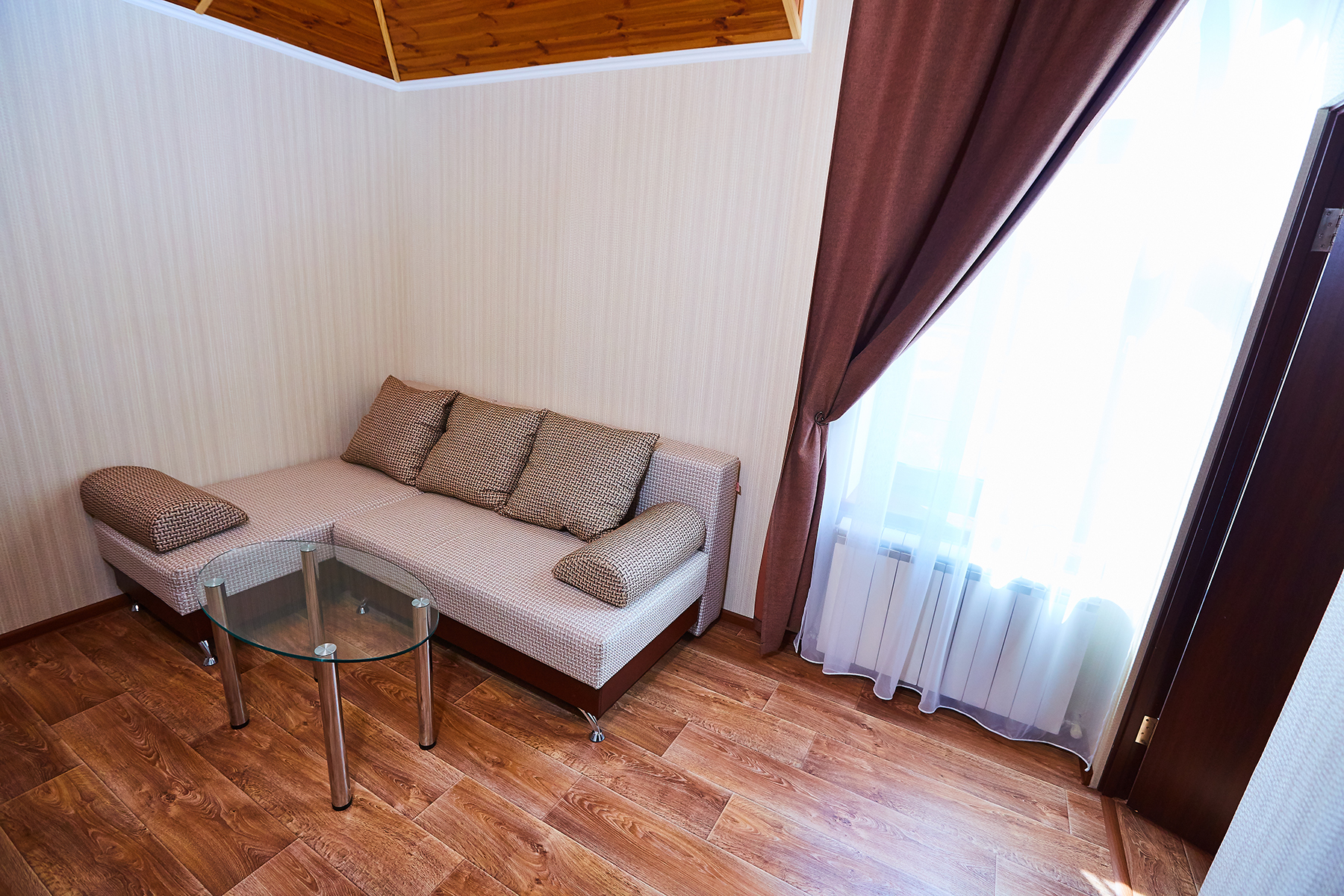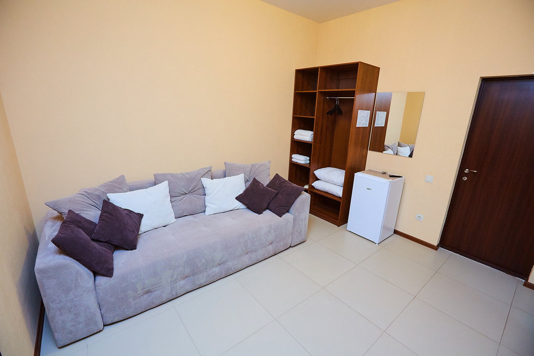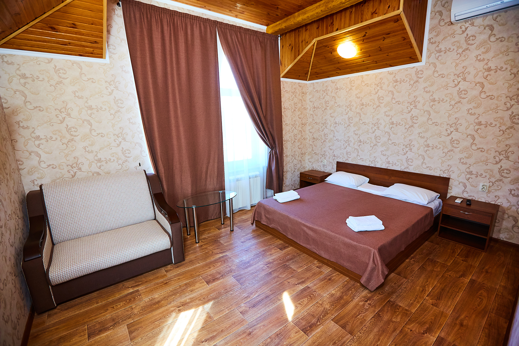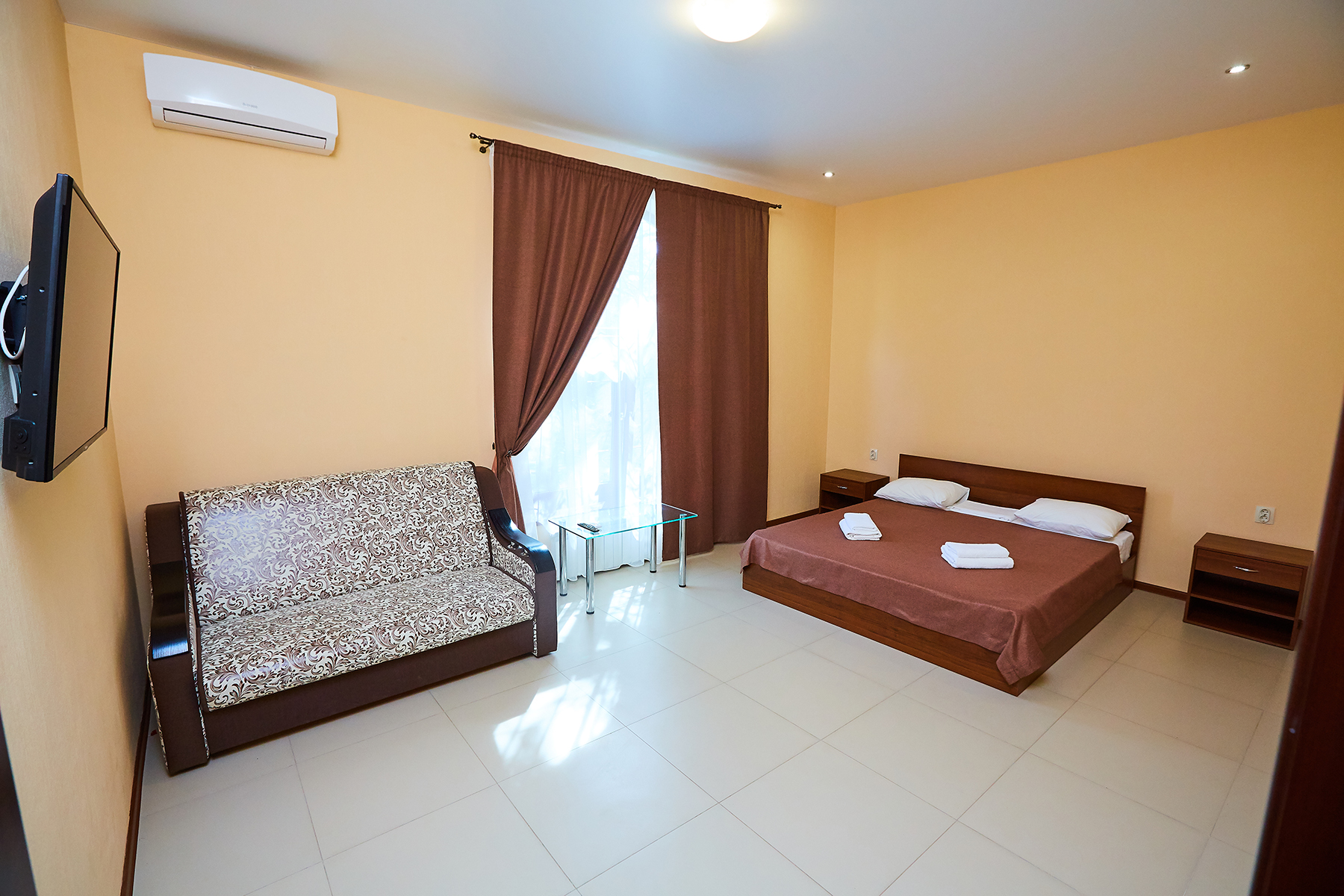 2 кімнатний номер зі спальнею та вітальнею. Можливість розміщення до 5-6 осіб (3 особи входять у вартість). Сніданок на 3 особи включено у вартість. Великі смарт LCD телевізори. У спальні знаходиться велике двоспальне ліжко (KING-SIZE) і розкладний диван. У вітальні є диван де вільно розмістяться 2 особи. Прилади: кондиціонер, LCD телевізор, холодильник, гардероб. Простора ванна кімната: душ, унітаз, сушка для рушників, умивальник. Велика площа номера.